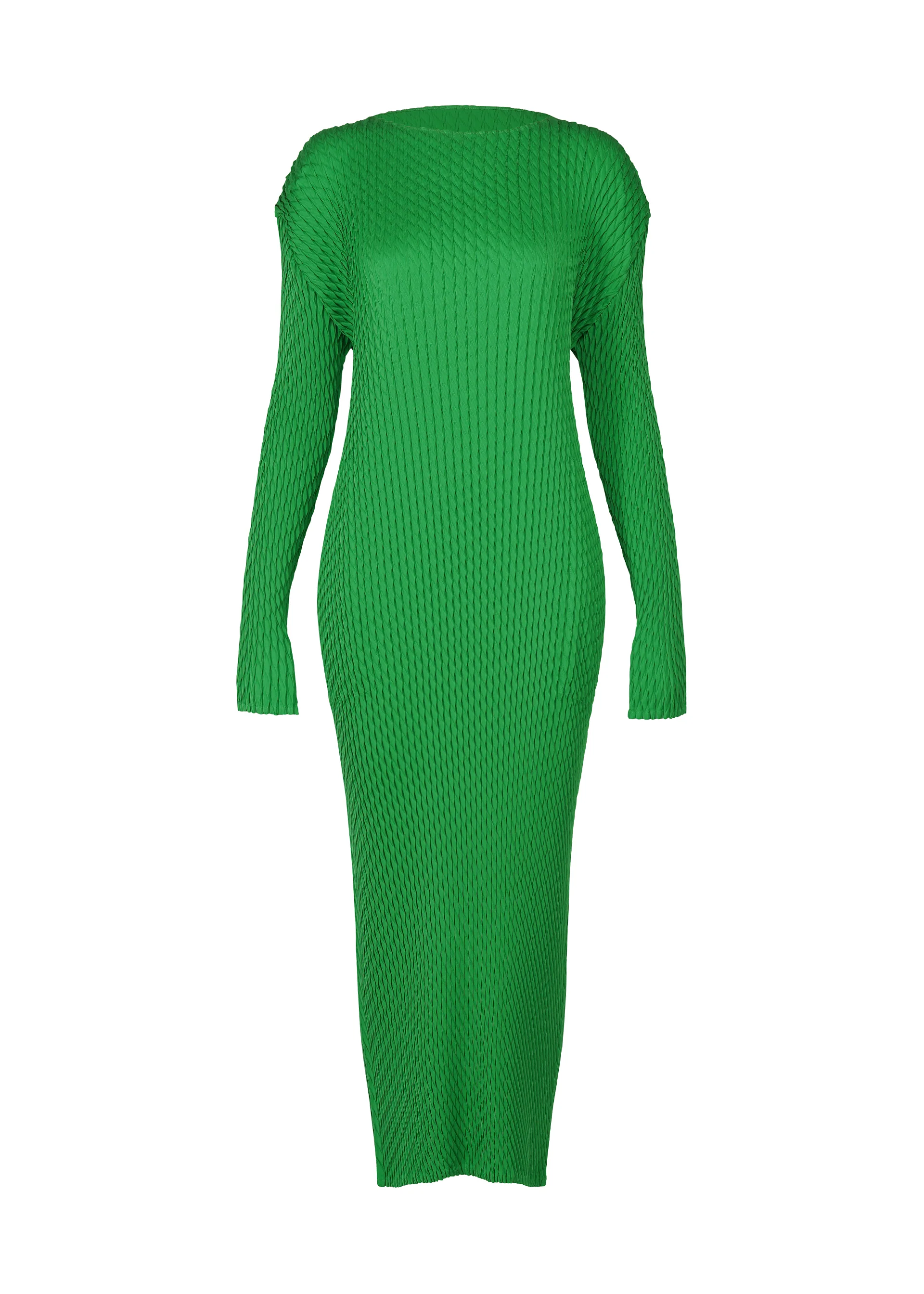 上品なサテン地の光沢が美しいプリーツ生地の丸首長袖ワンピース。ポリエステル繊維でありながら最先端の技術を用いてシルクの繊維構造を模倣することで、繊細で光沢感のある風合いが特徴です。プリーツ加工を2度施し、シンプルなシルエットでありながら身体に程よく馴染むデザインです。