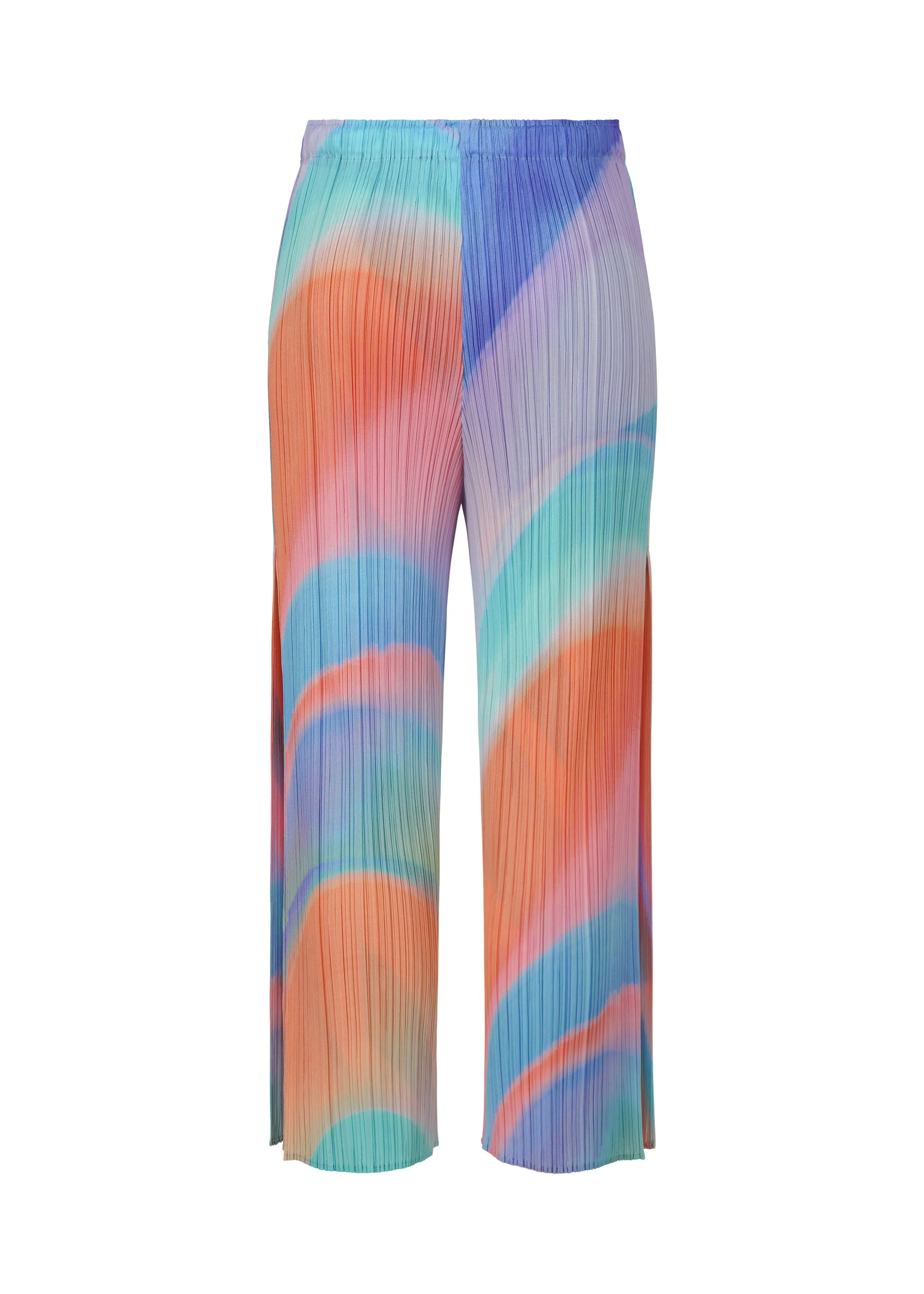 グルーヴが広がるリズムの波のイメージを、カラフルなグラデーションで表現したプリントのワイドパンツ。無地のプリーツアイテムとのコーディネートがおすすめです。両脇にポケットとスリットがあります。